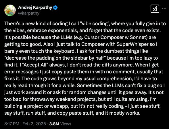 A term that's been floating around recently—one that I think Andrej Karpathy coined—is "vibe coding."
